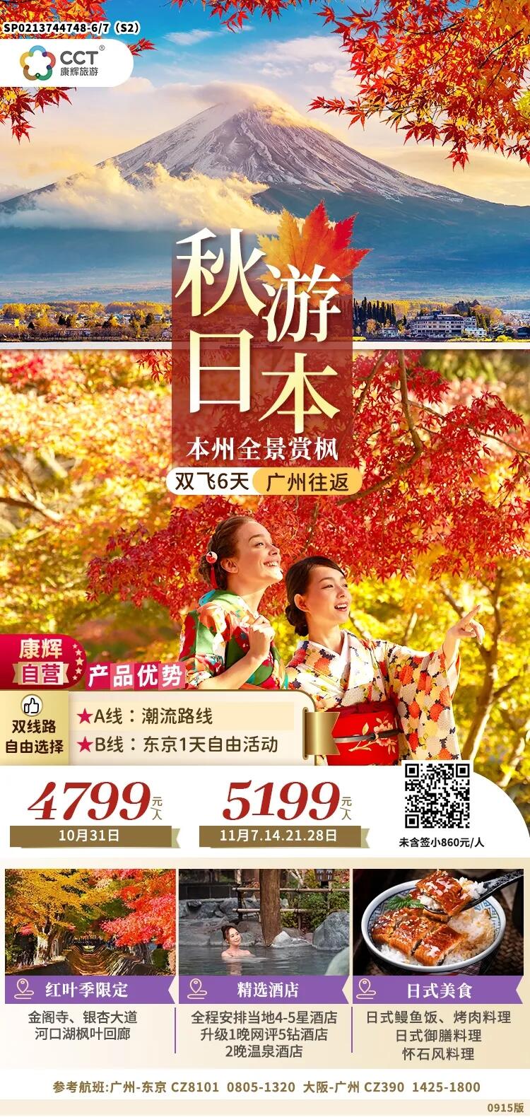 <自营日本>日本本州全景赏枫双飞6天(广州东阪)