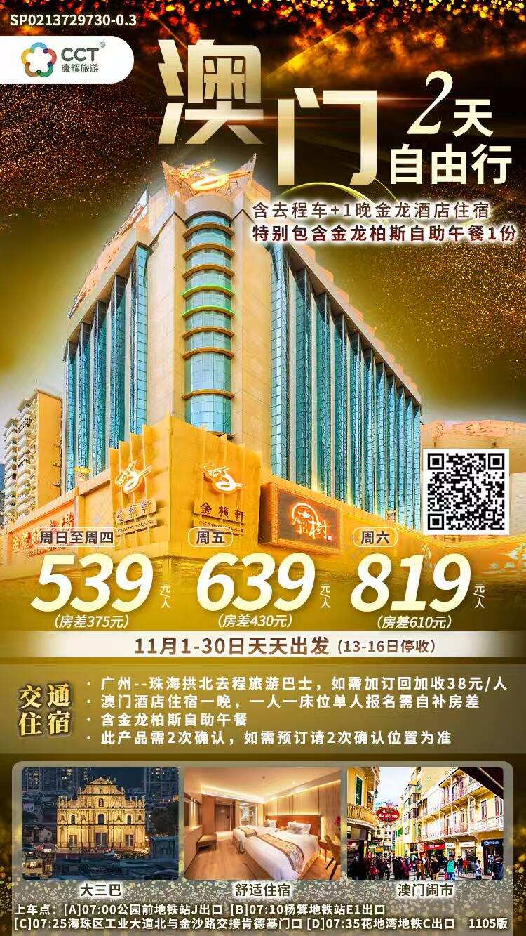 澳门酒店住宿一晚,一人一床位单人报名需自补房差含金龙柏斯自助午餐此产品需2次确认,如需预订请2次确认位置为准