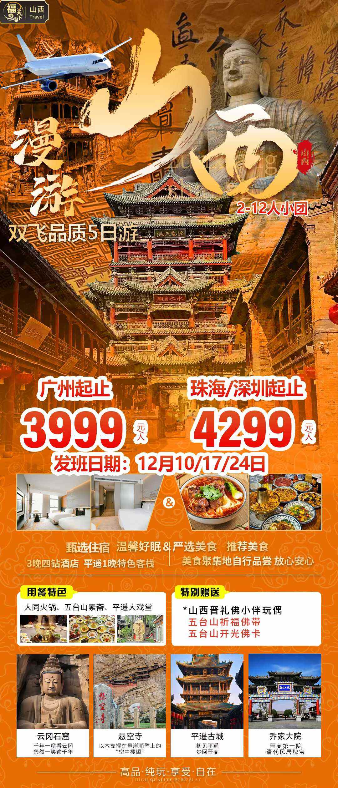 [转圈]漫游山西双飞5日游2-12人小团