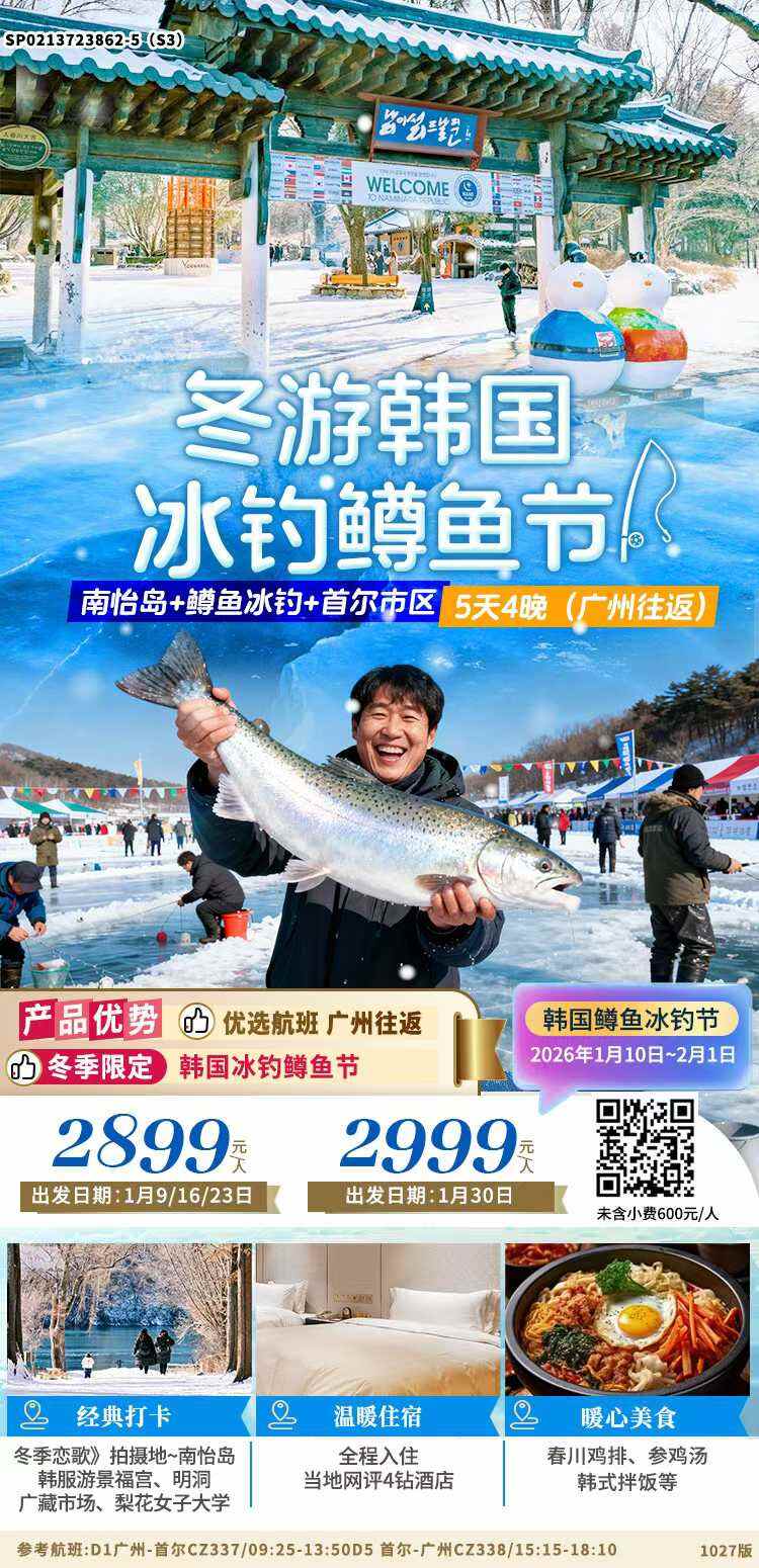 <冬游韩国>南怡岛+鳟鱼冰钓+首尔市区双飞5天4晚(广州往返)